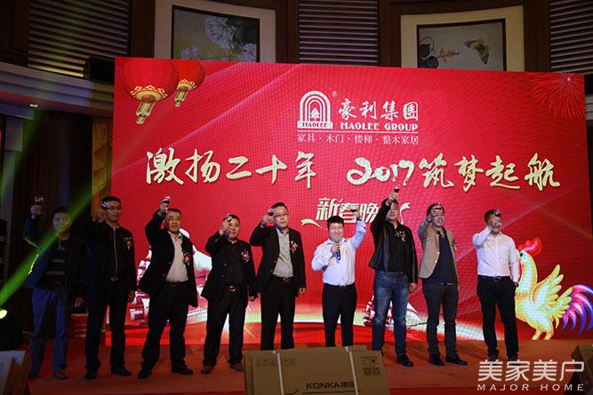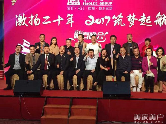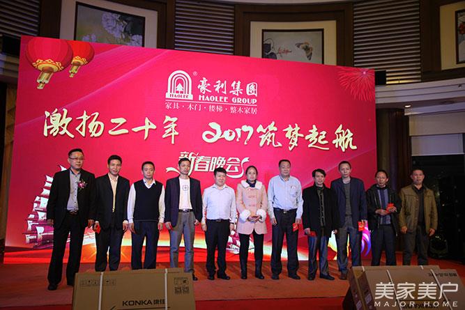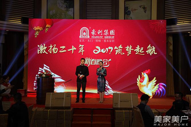 此次年会在热闹的开场舞《中国龙》的表演中拉开序幕。年会上,豪利集团董事长杜延金在致辞中说:“2016年已经过去,回首已经营20年的豪利,我感慨万千。20年来,在豪利人的辛勤努力下,以及在众多朋友们的关怀下,豪利已从一个小的作坊企业发展成为一家大型集团化企业。如今,豪利已从20年前仅有380平米的厂房、15名员工发展到现今2000多人,厂房面积15万平米的大型集团企业,这一切都离不开在座朋友、所有员工们辛勤的努力付出。20年来,豪利也取得了很多成绩与进步,已从单一生产木门转变为整体家居,备受业内外人士青睐。同时,我们邀请意大利的设计师参与到豪利的经营中来。我们的目的就是要把产品做到完美,服务好我们的客户。但目前行业仍存在很多问题需要豪利不断去摸索、完善。2017年,豪利要实现三个目标:第一,要力争使豪利的综合竞争力保持全行业稳居第一;第二是产品在销售的过程中要控制在零返工率;第三是要做到客户零投诉。2016年,豪利在全国承建了很多知名的建筑装饰工程,取得了良好的经济效益。其中,很多项目的装饰效果都超过了国外的一些知名建筑的装饰。此外,豪利在稳步发展的同时仍不忘奉献爱心,2016年已资助了山东、重庆、江苏多所学校及敬老院。2017年,我希望豪利在众多朋友的支持与全体员工的努力下,将豪利做的更好。”