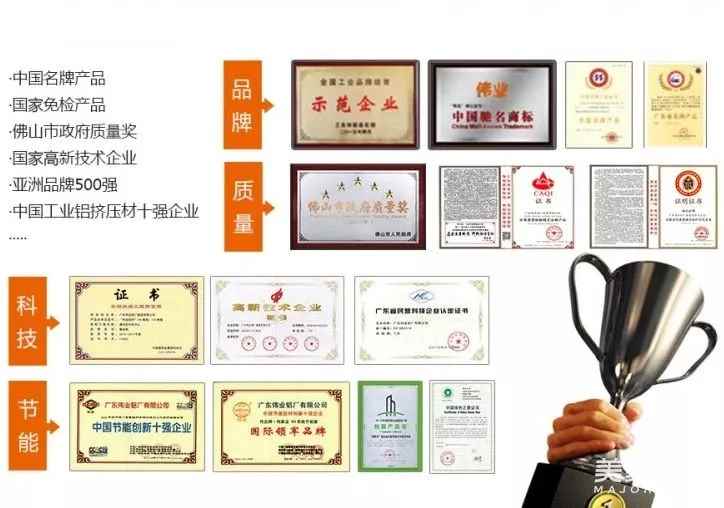 在激烈的市场竞争中,伟业铝材实现品牌根植本土,着眼“一带一路”中国发展战略,开拓进取,构建全球供应链服务体系,将绿色铝应用循环产业链系统延伸至全球市场。凭借严格的国际标准、军工品质、卓越的品牌形象和系统的解决方案,“伟业”赢得了铝型材领域的标杆形象;先后获得“国家首批产品质量免检”、”国家守合同重信用企业”、“国家绿色工厂”、“佛山市政府质量奖”、“中国名牌产品”、“中国驰名商标”、“中国工业铝挤压材十强企业”,“中国建筑铝型材十强企业”,“中国房地产开发企业500强首选供应商”、“亚洲品牌500强企业”、“高新技术企业”、全国铝合金型材产业知名品牌创建示范区“十大骨干企业”等系列名誉称号,全面展示了伟业铝材在铝加工行业的领导地位。